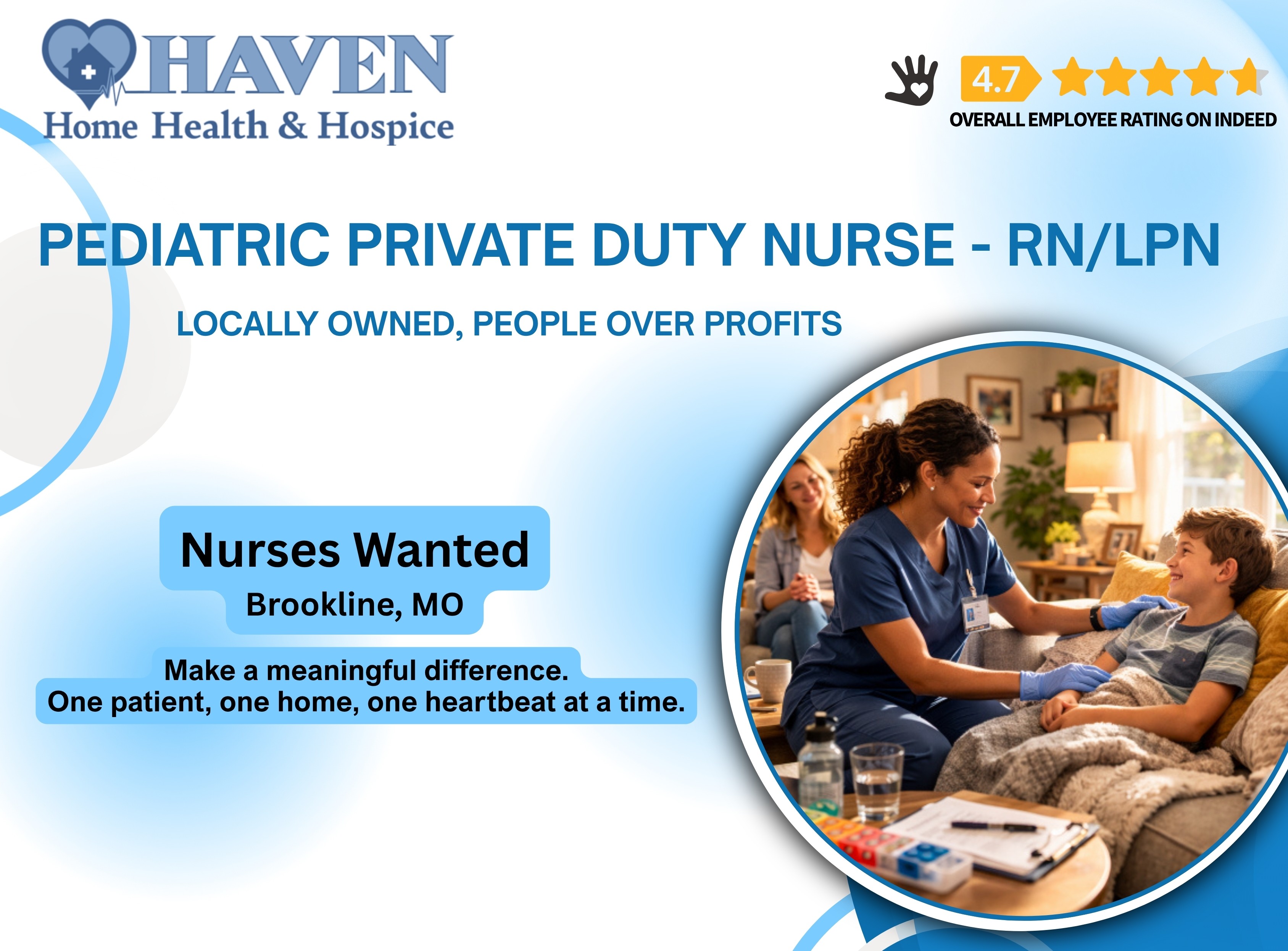 At Haven Home Health & Hospice, we believe nursing is personal. Our Private Duty Nurses provide one-on-one care to children in the comfort of their homes, creating a calm, supportive environment. If you have a passion for pediatrics and want to connect directly with patients, this role is designed for you: focused care, less charting, and a real opportunity to impact a child’s life.
